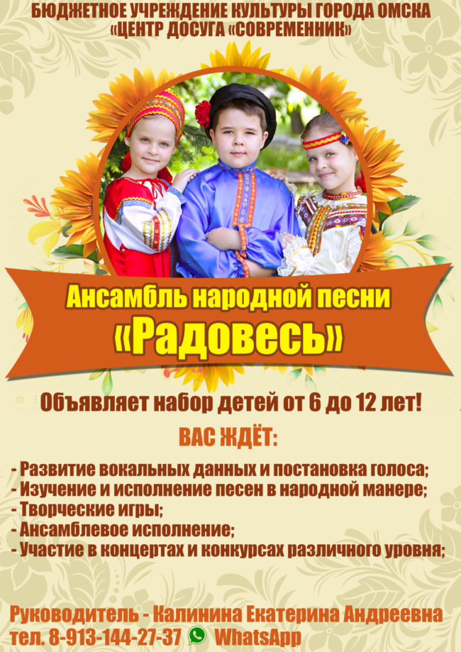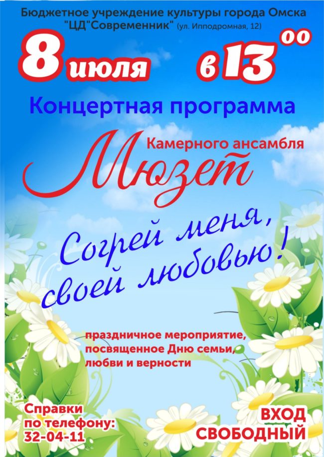 В ГОД СЕМЬИ особое значение приобретает праздник «ДЕНЬ СЕМЬИ , ЛЮБВИ И ВЕРНОСТИ» который наша страна отметит уже 8 июля! Мы приглашаем Вас друзья, Омичи и гости нашего города на концертную программу Камерного ансамбля «Мюзет» которая состоится 8 июля в 13.00 в ЦЕНТРЕ ДОСУГА «СОВРЕМЕННИК»! ВХОД СВОБОДНЫЙ!